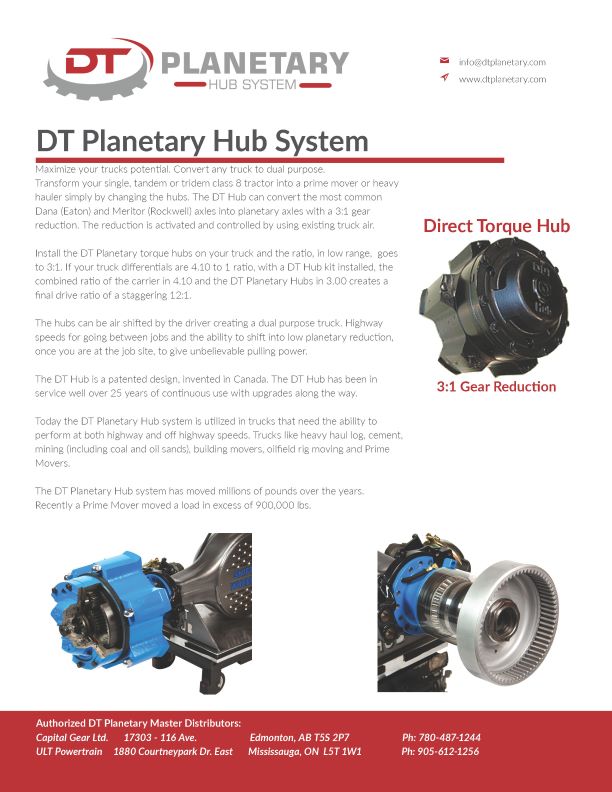 At Capital Gear, we offer the revolutionary DT Planetary Hub System, designed to transform any truck into a dual-purpose powerhouse. Whether you have a single, tandem, or tridem class 8 tractor, the DT Hub can convert the most common Dana (Eaton) and Meritor (Rockwell) axles into planetary axles with an impressive 3:1 gear reduction. This innovative system allows your truck to achieve highway speeds for transit and switch to low planetary reduction for unbeatable pulling power on job sites.